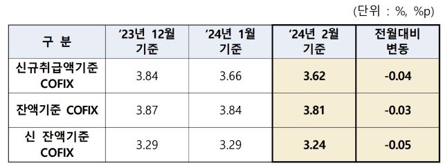 15일 전국은행연합회는 2월 기준 코픽스를 공시했다. 신규취급액기준 코픽스는 전월 대비 0.04%p 하락한 3.62%로 나타났다. 잔액기준 코픽스는 전월 대비 0.03%p 하락한 3.81%, 신잔액기준 코픽스는 전월 대비 0.05%p 내린 3.24%다.