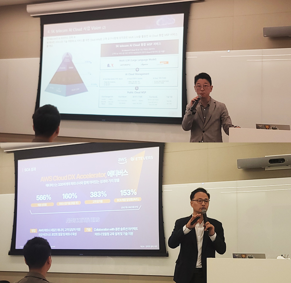 SK텔레콤의 황웅상 MSP 사업팀 총괄(상)과 김준성 에티버스 전무가 AWS와의 협업을 설명하고 있다.