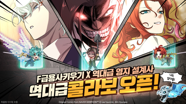 이번 공동 이벤트로 F급 용사 키우기에는 역대급 영지 설계사의 주인공인 로이드와 ▲하비엘 ▲알리시아 ▲용용이 등 웹툰 인기 캐릭터가 기존 용사 캐릭터에 적용 가능한 스킨 2종과 동료 2종으로 출시된다.