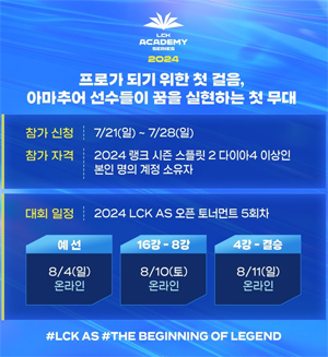 한편 LCK 아카데미 시리즈는 아마추어와 프로를 잇는 LCK 산하 대회로 프로를 지망하는 아마추어 선수들이 참가한다. LCK 리그 법인이 주최하고 한국e스포츠협회가 주관한다.