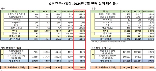 (서울=NSP통신) 강은태 기자 = GM 한국사업장이 7월 한 달 동안 총 2만2564대(완성차 기준) 판매실적을 달성했으나 전년 동월 대비 44.6% 감소했다.