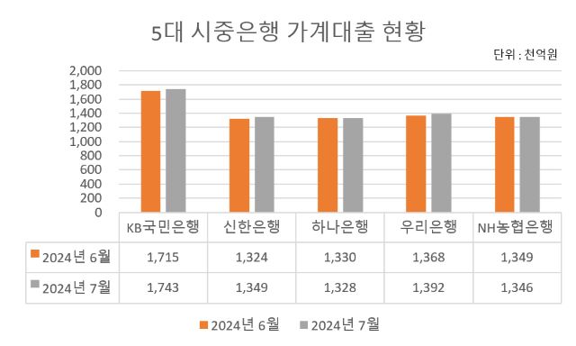 2일 금융권으로부터 취합한 통계에 따르면 지난달 말 기준 가계대출 잔액은 ▲KB국민은행 174조 3246억원 ▲신한은행 134조 8659억원 ▲하나은행 132조 7512억원 ▲우리은행 139조 1751억원 ▲NH농협은행 134조 6215억원으로 집계됐다. 하나은행과 NH농협은행의 가계대출 잔액은 전월 대비 약 2000~3000억원 감소했다.