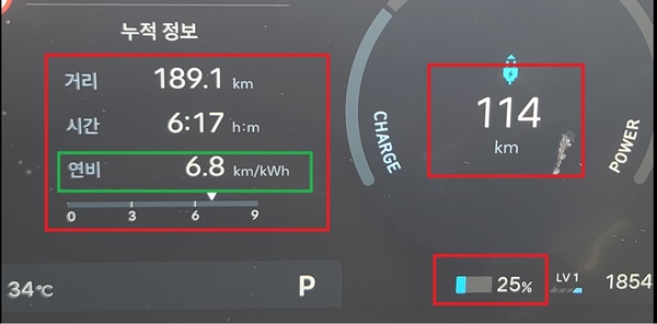 왜냐하면 배터리 잔량 76%에서 주행을 시작해 전비 체크 당시 25%의 배터리가 잔량으로 남아 있어 실제 총 189.1km를 6시간 17분 동안 주행 중 사용한 배터리의 사용량의 51%여서 나머지 49%의 전비를 모두 사용했다면 충분히 1회 충전 주행가능거리 417km를 주행할수 있다는 계산이 가능하기 때문.