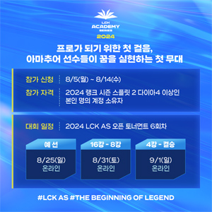 한편 LCK 아카데미 시리즈는 아마추어와 프로를 잇는 LCK 산하 대회로 프로를 지망하는 아마추어 선수들이 참가한다. LCK 리그 법인이 주최하고 한국e스포츠협회가 주관하며, 나이스게임TV가 방송 제작, 우리은행이 후원하고 있다.