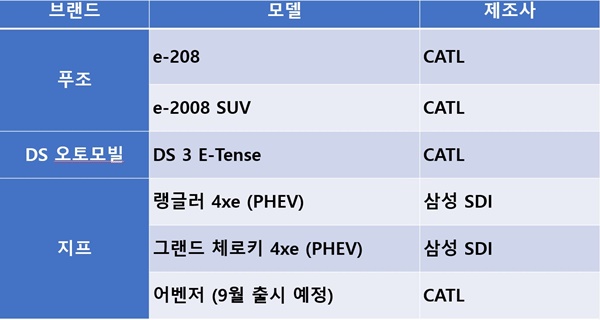 한편 푸조의 e-208 및 e-2008 SUV 모델과 DS 오토모빌의 DS 3 E-Tense 모델은 CATL사의 배터리를 장착했고 다음달 출시 예정인 지프의 첫 순수 전기 SUV 어벤저 역시 CATL사의 배터리를 사용한다. 지프의 PHEV 차종인 랭글러 4xe와 그랜드 체로키 4xe는 삼성 SDI 배터리가 들어갔다.