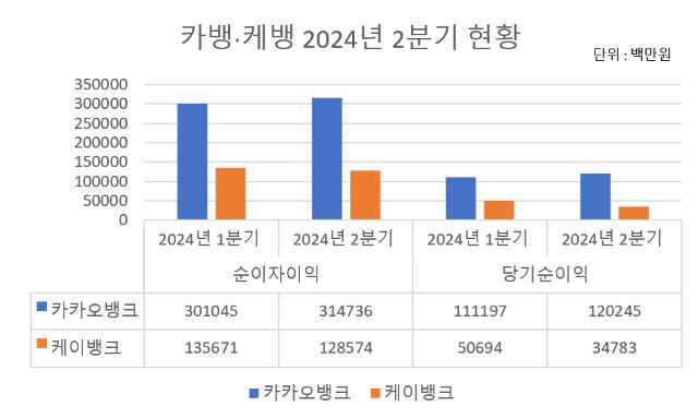 16일 카카오뱅크와 케이뱅크가 공시한 2분기 실적에 따르면 카카오뱅크의 2분기 당기순이익은 1202억 4500만원으로 전분기 대비 약 8.1% 증가했다. 케이뱅크의 2분기 순익은 347억 8300만원으로 전분기 대비 약 31.4% 감소했다.