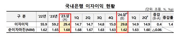 국내은행의 상반기 이자이익은 29조 8000억원으로 전년 동기 대비 4000억원 증가했다. 이는 이자수익자산 증가로 인한 결과며 순이자마진(NIM)이 0.06%p 축소함에 따라 이자이익의 증가세는 둔화됐다. 이자이익은 2022년 상반기 18.8%, 2023년 상반기 12.2% 증가했다가 올해 상반기 1.4% 늘었다.