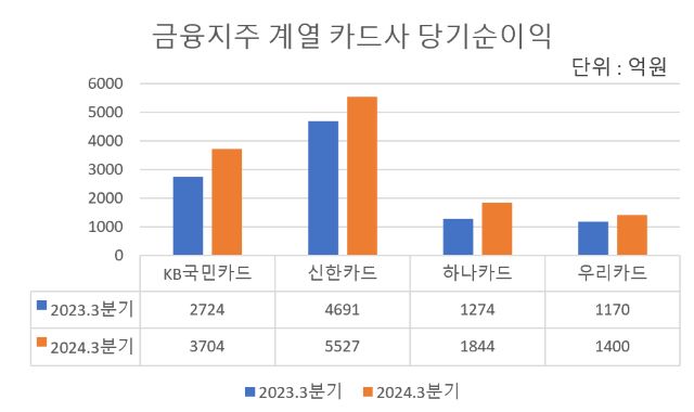 카드사별로 살펴보면 3분기 당기순이익이 가장 큰 곳은 신한카드다. 신한카드의 당기순이익은 5527억원으로 전년 동기 대비 18% 늘었다.