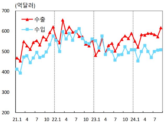 (서울=NSP통신) 강수인 기자 = 그래프 속 빨간 세모로 표현된 수출이 2024년 7월 이후 내림세를 보이다가 오른쪽 끝에 가까워지며 급격히 올랐다. 반도체 수출이 지난달에 비해 36.7% 뛰고 자동차 부품사의 파업 여파로 부진했던 자동차 및 자동차 부품 수출도 살아난 영향이다.