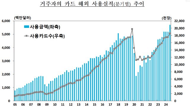 26일 한국은행이 발표한 ‘2024년 3분기 거주자의 카드 해외 사용실적’에 따르면 올 3분기 거주자의 해외 사용금액은 57억 1000만달러(7조 9945억 7100만원)로 사상 최대치를 기록했다. 전분기 대비로는 10.1% 증가했고 전년 동기 대비로는 19.1% 늘었다.