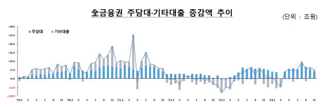 특히 주택담보대출의 변화폭이 컸다. 은행 자체 주담대는 지난 10월 1조 5000억원 증가에서 지난달 8000억원 감소로 전환됐다. 반면 제2금융권 주담대는 같은 기간 1조 9000억원 증가에서 2조 6000억원 증가로 증가폭이 커졌다.