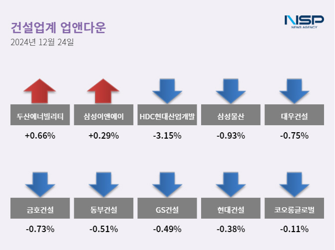 (서울=NSP통신) 정현우 기자 = 24일 코스피(-0.06%)는 하락, 코스닥(0.13%)은 상승했다. 건설주는 전 거래일 대비 0.33% 하락했고 80종목 가운데 27종목이 상승, 46종목이 하락했다. 보합세는 7종목이다.