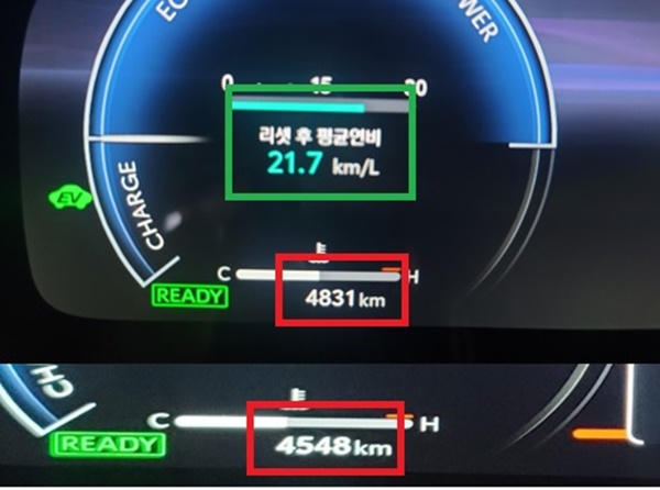 총 293km를 주행한 후 체크 한 토요타 캠리 하이브리드 모델의 실제 주행 연비는 놀랍게도 21.7km/L를 기록했다.