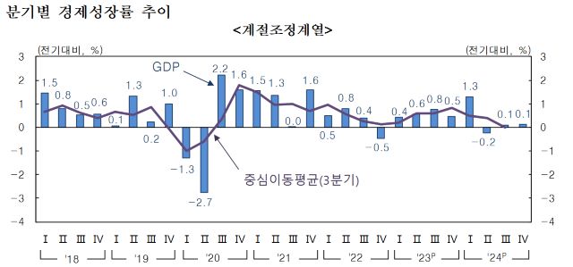 23일 한국은행이 발표한 ‘2024년 4분기 및 연간 실질 국내총생산’ 속보에 ᄄᆞ르면 지난해 4분기 성장률은 전분기 대비 0.1%를 기록했다. 전년 동기 대비로는 1.2% 성장이다.