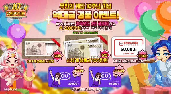(서울=NSP통신) 이복현 기자 = 넵튠(각자대표 강율빈, 정욱)의 대표 모바일게임 무한의 계단이 출시 10주년을 기념해 2000만원 규모의 경품 이벤트를 진행한다.