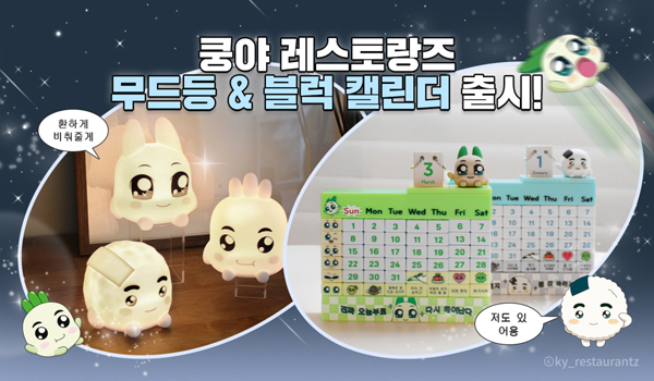 무드등은 기본 모드부터 7가지 색깔로 변경할 수 있는 컬러모드로 다양한 연출이 가능하며 블럭 캘린더는 쿵야 레스토랑즈의 캐릭터성을 느낄 수 있는 아이콘과 문구 블럭을 활용해 원하는 달력으로 직접 커스터마이징 가능한 상품이다.