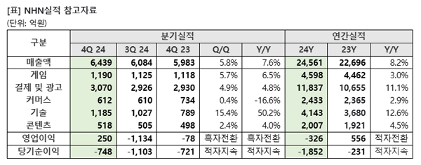 NHN의 연결기준 2024년 4분기 매출은 전년 동기 대비 7.6%, 전분기 대비 5.8% 증가한 6439억원, 영업이익은 250억원으로 전년동기, 전분기 대비 각각 흑자전환했다.