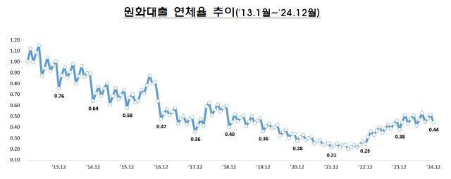 17일 금융감독원이 발표한 ‘2024년 12월 말 국내은행의 원화대출 연체율 현황(잠정)’에 따르면 지난해 말 국내은행의 원화대출 연체율은 0.44%로 나타났다. 전월 말 대비로는 0,08% 하락했고 전년 동월 말 대비로는 0.06%p 상승했다.