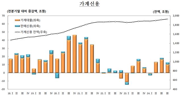18일 한국은행이 발표한 ‘2024년 4분기 가계신용(잠정)’에 따르면 지난해 4분기 가계신용은 1927조 3000억원으로 집계됐다. 그중 가계대출 잔액은 1807조원으로 주담대를 중심으로 증가폭이 축소돼 전분기말 대비 10조 6000억원 증가했다. 판매신용 잔액은 120조 3000억원으로 전분기 대비 2조 4000억원 증가했다.