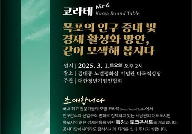 (전남=NSP통신) 윤시현 기자 = 국내 최고 전문가들의 모임인 코라테(Korea Round Table)에서 사회봉사 및 재능기부 차원에서 인구감소와 산업구조 변화로 침체하고 있는 서남권 대표 도시 목포를 찾아, 젊은 경제인들에게 특강과 토크콘서트를 진행한다.
