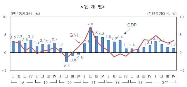 (서울=NSP통신) 강수인 기자 = 지난해 연간 1인당 국민총소득(GNI)이 3만 6624달러(5326만 9608원)로 전년 대비 1.2% 증가했다. 2년 연속 증가세다. 연간 실질 국내총생산(GDP)은 전년 대비 2% 증가했다.