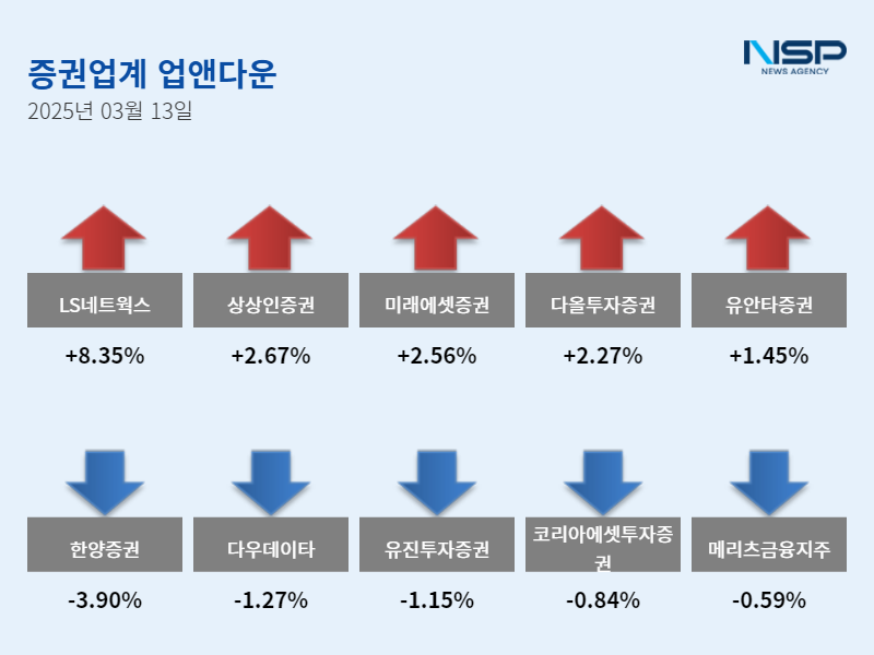 (서울=NSP통신) 설희 기자 = 13일 코스피(-0.05%), 코스닥(-0.92%)은 모두 하락했다. 이 가운데 증권주는 전거래일 대비 0.22% 상승했다. 증권주는 38종목 가운데 상승 18개였고 보합 4개, 하락 16개였다.