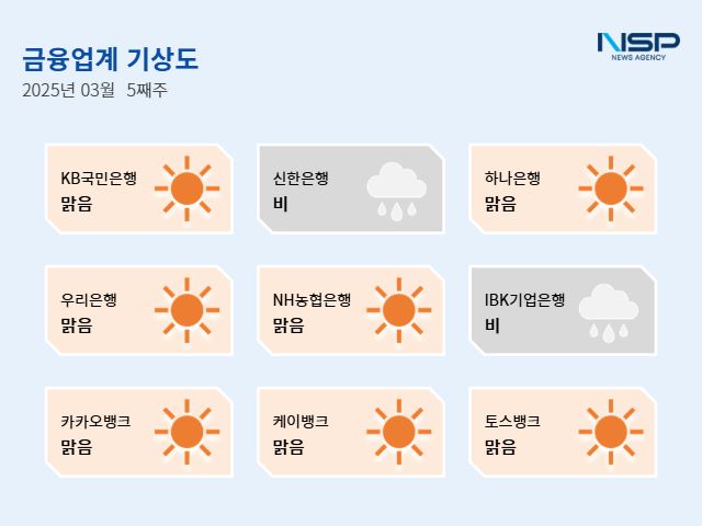 (서울=NSP통신) 강수인 기자 = 2025년 3월 5주차 금융업계기상도는 KB국민은행·하나은행·우리은행·NH농협은행·카카오뱅크·케이뱅크·토스뱅크의 ‘맑음’, 신한은행·IBK기업은행의 ‘비’로 기록됐다.