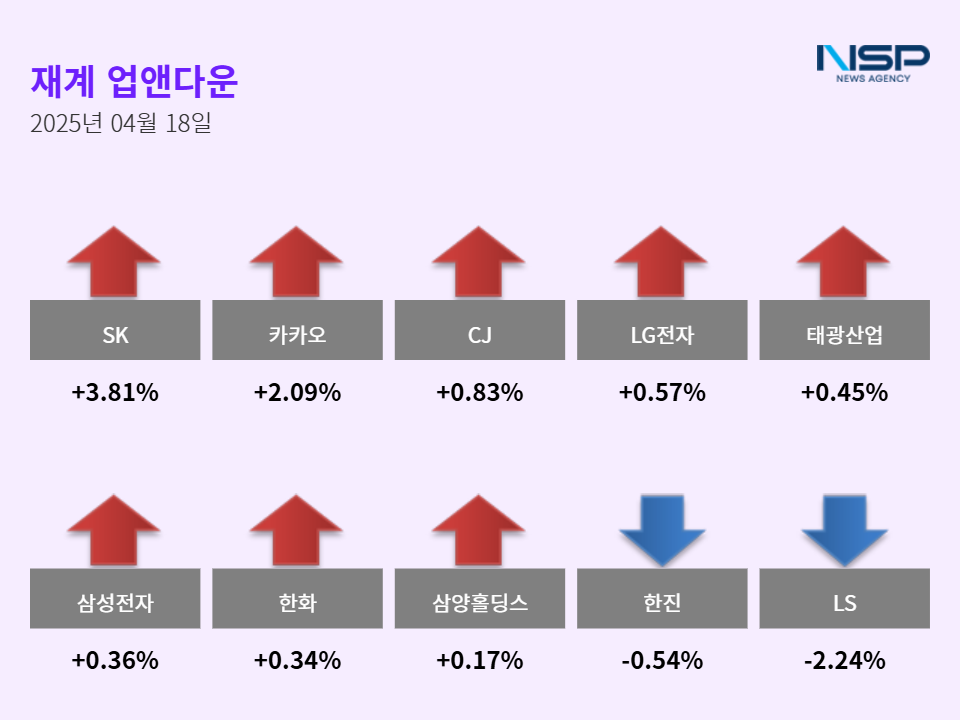 (서울=NSP통신) 최아랑 기자 = 18일 코스피(+0.53%)와 코스닥(+0.85%)은 모두 상승했다. 이 가운데 10대 그룹주는 엇갈린 흐름을 보였다. 가장 큰 변동을 보였던 종목은 SK다. SK는 3.81%(4600원) 올라 12만5200원으로 장을 마감했다.