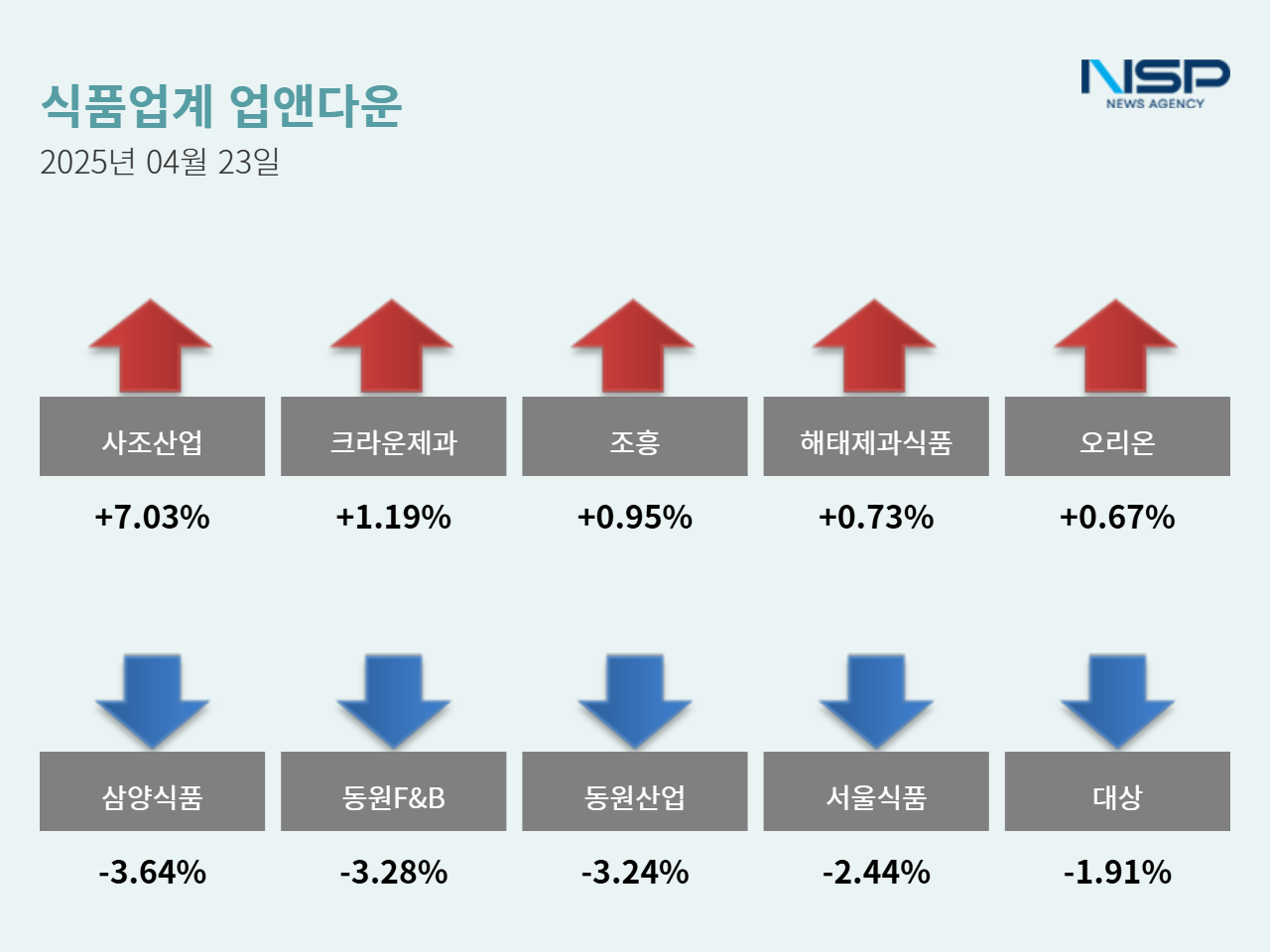 (서울=NSP통신) 옥한빈 기자 = 23일 코스피(+1.57%)와 코스닥(+1.39%)은 모두 상승했다. 이 가운데 식품주는 전거래일 대비 0.96% 하락했다. 식품주는 90종목 가운데 37종목이 상승, 47종목이 하락했다. 보합세는 6종목이다.