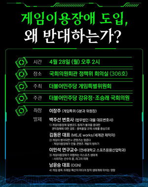 (서울=NSP통신) 이복현 기자 = 더불어민주당 게임특별위원회(이하 게임특위)가 ‘게임이용장애’ 도입 논란에 대한 해법을 모색하고자 오는 4월28일 오후2시 국회의원회관 정책위 회의실 (306호)에서 정책토론회 ‘게임이용장애 도입, 왜 반대하는가’를 개최한다.