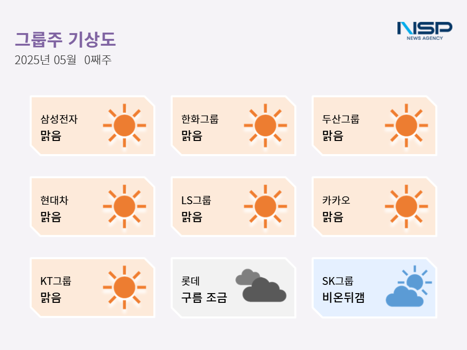 (서울=NSP통신) 최아랑 기자 = 2025년 5월 3주차 그룹주 기상도는 삼성전자·두산그룹·한화그룹‧현대차·LS·카카오·KT의 ‘맑음’, 롯데그룹의 ‘구름 조금’, SK그룹의 ‘비 온 뒤 갬’으로 기록됐다.