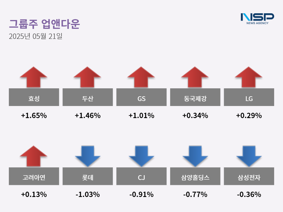 (서울=NSP통신) 최아랑 기자 = 21일 코스피(+0.91%)와 코스닥(+1.13%)은 모두 상승했다. 그러나 10개의 그룹주는 상반된 흐름을 보였다. 주가에 가장 큰 변동이 있었던 종목은 효성이다. 효성은 1.65%(900원) 상승해 5만5500원으로 장을 마쳤다.