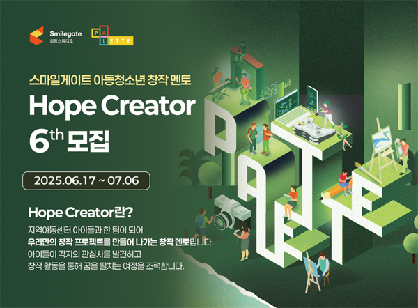 (서울=NSP통신) 이복현 기자 = 스마일게이트 희망스튜디오(이사장 권혁빈, 이하 희망스튜디오)가 내달 6일까지 팔레트 멘토 ‘호프 크리에이터’(Hope Creator) 6기를 모집한다.