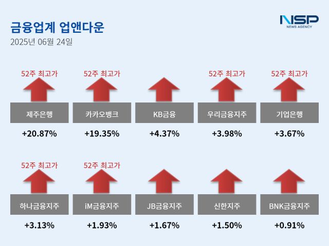 기업은행은 전거래일 대비 3.67%(640원) 올라 1만8060원으로 장을 마감했다. 기업은행은 장중 1만8180원까지 오르며 52주 신고가를 기록했다. 하나금융지주는 전거래일 대비 3.13%(2500원) 상승해 8만2300원으로 장을 마쳤다. 하나금융지주도 장중 8만3000원까지 올라 52주 신고가를 기록했다.