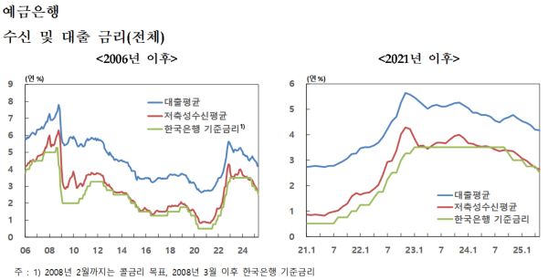 30일 한국은행이 발표한 ‘2025년 5월 금융기관 가중평균금리’에 따르면 5월중 예금은행의 신규취급액 기준 저축성수신금리는 연 2.63%로 전월 대비 0.08%p 하락했다. 대출금리는 연 4.17%로 전월 대비 0.22%p 내려갔다.