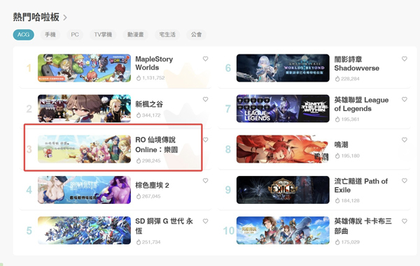 RO선경전설Online:낙원도 라그나로크 온라인의 초창기 감성을 담은 클래식한 재미로 라그나로크 IP 충성도를 강화하는 데 한몫했다. 해당 타이틀은 론칭 직후 중화권 유명 게임 커뮤니티인 바하무트(Bahamut) 내 전체 게임 및 PC 게임 순위 3위에 오르며 흥행 초석을 다졌다.