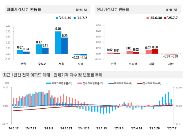 (서울=NSP통신) 강은태 기자 = 전국 주간 아파트가격은 7일 기준 7월 첫째주 매매가는 0.04%, 전세가 0.01%로 상승을 기록했다.