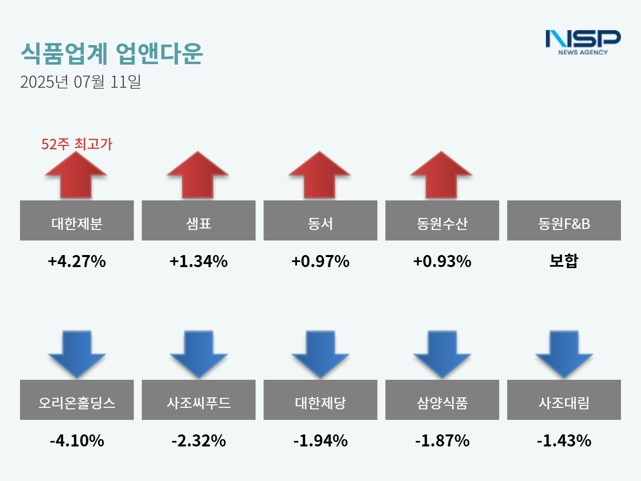 (서울=NSP통신) 옥한빈 기자 = 11일 코스피(-0.23%)는 하락, 코스닥(+0.35%)은 상승해 서로 엇갈린 양상을 보였다. 이 가운데 식품주는 전거래일 대비 0.72% 하락했다. 식품주는 91종목 가운데 39종목이 상승, 44종목이 하락했다. 보합세는 8종목이다.