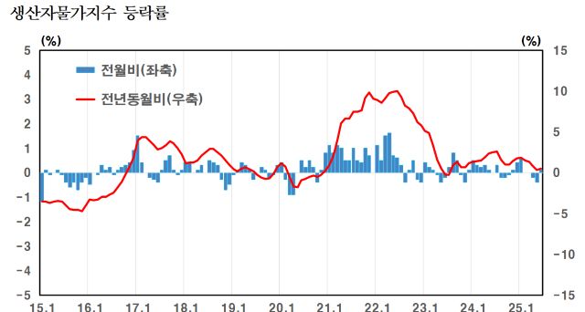 22일 한국은행이 발표한 ‘2025년 6월 생산자물가지수(잠정)’에 따르면 지난달 생산자물가지수는 전월 대비 0.1% 상승했다. 전년 동월 대비로는 0.5% 상승이다. 생산자물가지수는 지난 4월 0.2%, 5월 0.4% 감소한 이후 증가 전환했다.