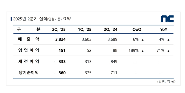 (서울=NSP통신) 이복현 기자 = 엔씨소프트(036570)가 2025년 2분기 연결기준 매출 3824억원, 영업이익 151억원, 당기순손실 360억원을 기록했다.
