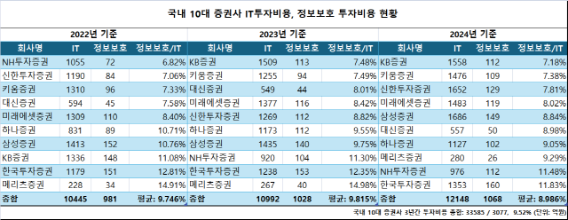 입수된 10대 증권사의 IT투자비용에 따르면 2022, 2023, 2024년 3개년간의 평균 IT 총 투자비용은 1조1195억원이었으며 정보보호 투자비용은 약 1026억원이었다. 연도별 정보보호 투자비율로 보면 2022년 9.75%, 2023년 9.82%, 2024년 8.99%로 3개년 평균 9.2%였다.