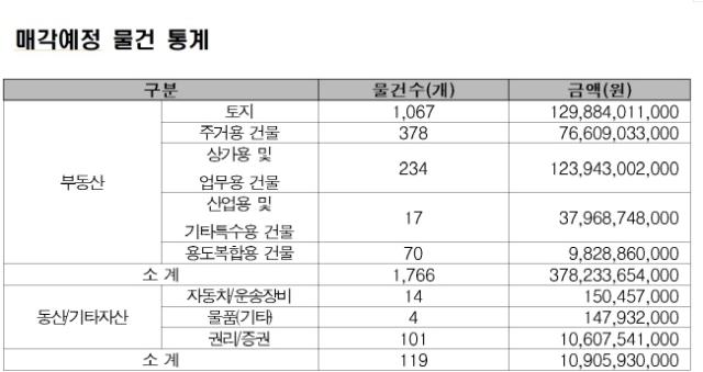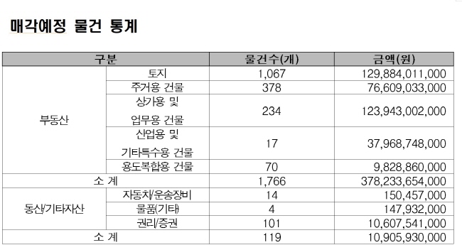 또한 아파트, 주택 등 주거용 건물도 서울, 경기 등 수도권 소재 물건 152건을 포함해 총 378건이 공매되고 특허권, 출자증권 등 동산도 매각된다.