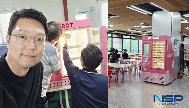 NSP통신-(왼쪽부터) 고 대표가 미니냉장고(자판기) 개발 완료하고 기뻐하는 사진과 실제 시중에 설치돼 있는 모습 (사진 = 옥한빈 기자)