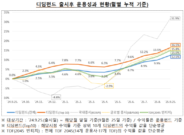 금융투자협회는 같은 기간 국내증시(KOSPI)는 8.8% 하락 후 31.9%까지 반등, 글로벌증시(S&P500)은 2.9% 하락 및 15.8% 상승 범위 내 등락했다며 디딤펀드가 높은 시장 변동성 속 상대적으로 낮은 변동성을 보이며 안정적 수익 흐름을 이어갔다고 설명했다.