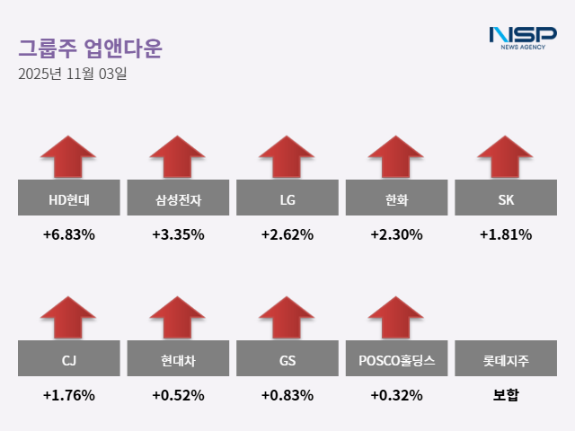 SK와 CJ는 각각 1.81%(4500원), 1.76%(3000원) 올라 25만3000원과 17만3700원에 장을 마쳤다.