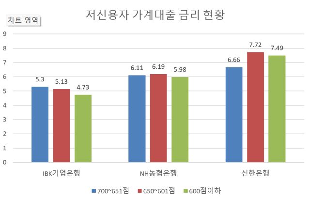IBK기업은행의 신용등급 600점 이하의 가계대출금리는 4.73%로 651~700점대 금리인 5.40%보다 0.57%p 낮다. 가산금리가 0.45%p 낮은 영향이다. 가산금리는 신용등급에 따라 연체율, 법정비용, 위험프리미엄 등 리스크를 감안해 은행이 기준금리에 가산하는 금리다.