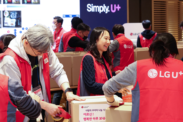LG유플러스 임직원과 협력사 직원 60여명은 17일 용산사옥에서 홀로 사는 어르신 730가구에 전달할 꾸러미를 제작했다.
