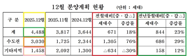 (서울=NSP통신) 강은태 기자 = 대한주택건설협회(회장 정원주)에 따르면 12월 14개 중견 주택업체가 11개 사업장에서 총 4488세대를 분양하는 것으로 집계됐다. 이는 1전 월(3817세대) 대비 671세대 증가한 것이고 전년 동월(3644세대) 대비 844세대 증가한 수치다.