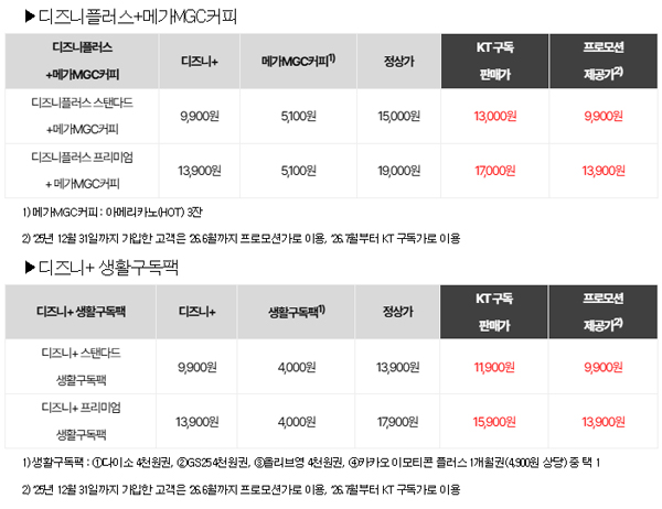 (서울=NSP통신) 이복현 기자 = KT(030200)가 OTT 서비스 디즈니+에 메가MGC커피 및 생활 밀착형 쿠폰 혜택을 결합한 신규 구독팩 2종을 출시했다.