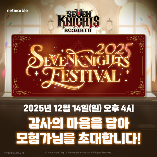 (서울=NSP통신) 이복현 기자 = 넷마블(251270)이 수집형 RPG 세븐나이츠 리버스 오프라인 이용자 행사 ‘2025 세븐나이츠 페스티벌’을 12월 14일 잠실 DN 콜로세움에서 개최한다.